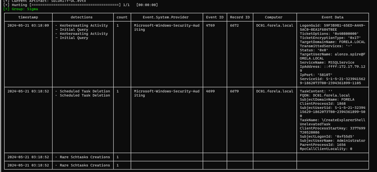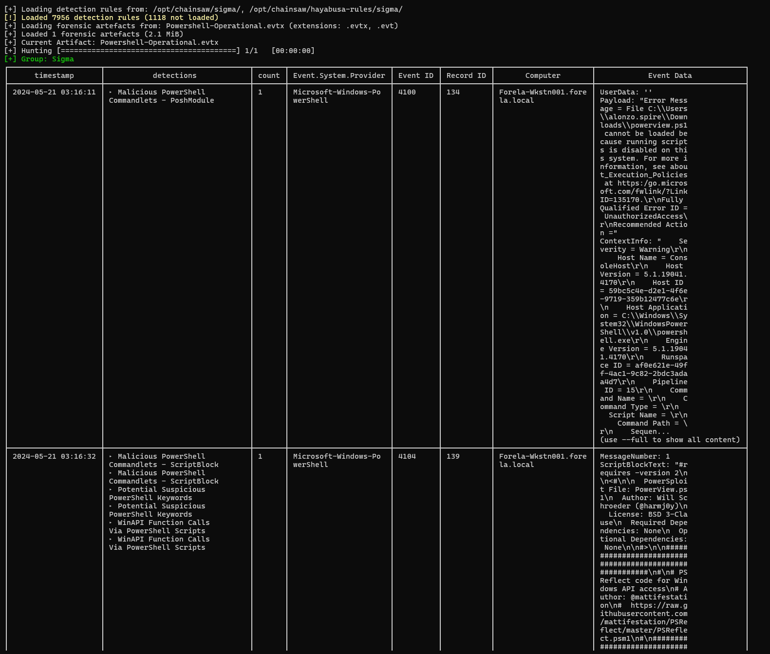 chainsaw hunt *.evtx --sigma /opt/chainsaw/sigma/ --sigma /opt/chainsaw/hayabusa-rules/sigma/ --mapping /opt/chainsaw/mappings/sigma-event-logs-all.yml
