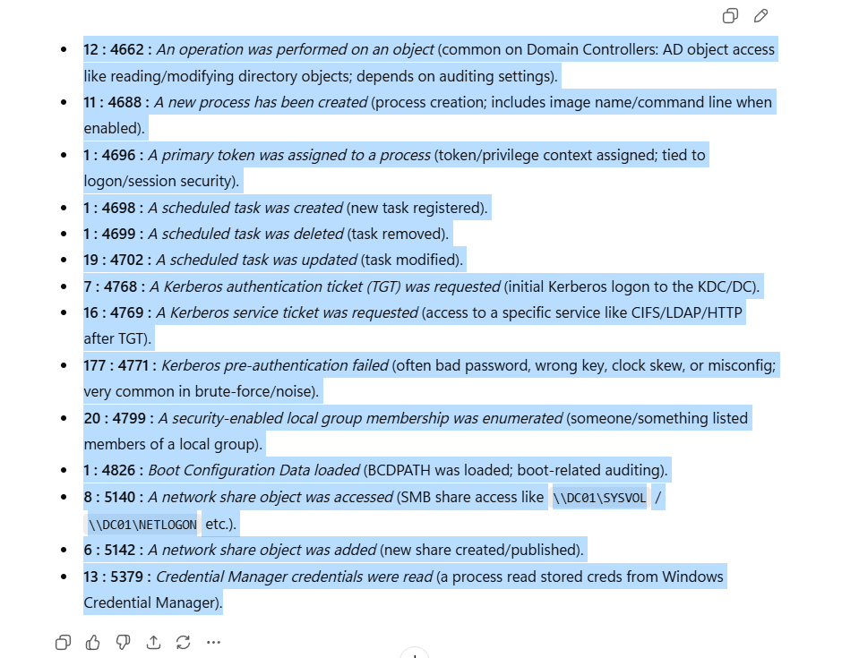 Next: dump DC security log to JSON for precise parsing.