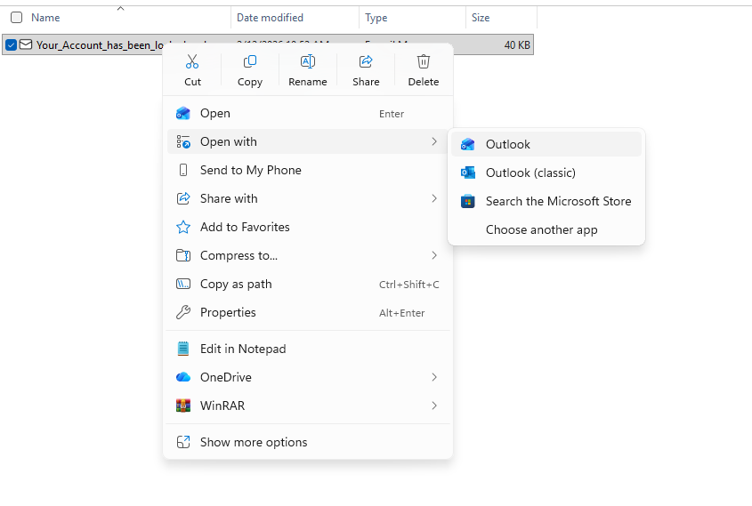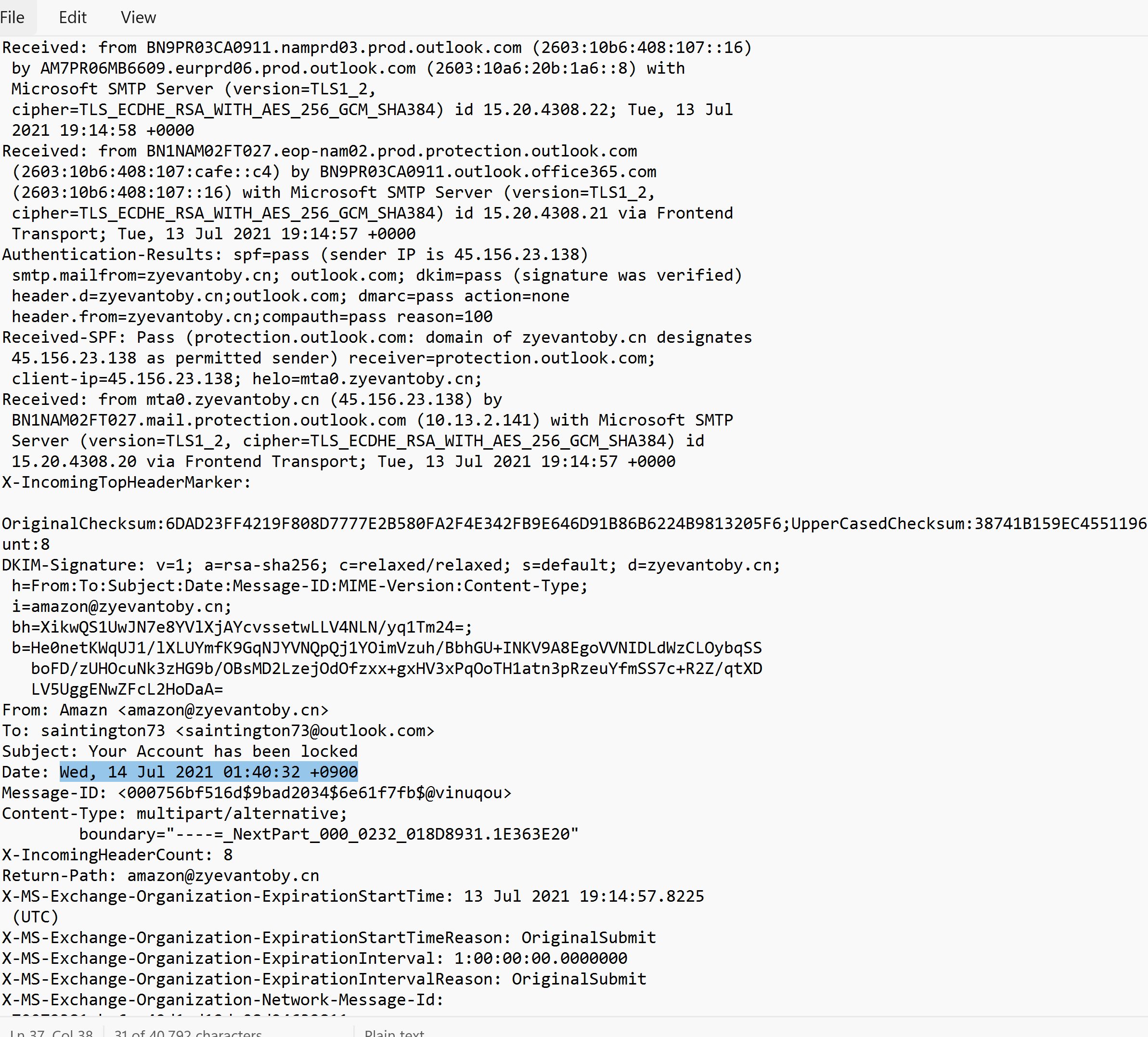 Opened the .eml in a mail client to view the sender details, then confirmed it in the raw headers.