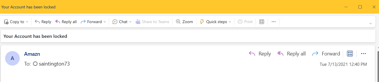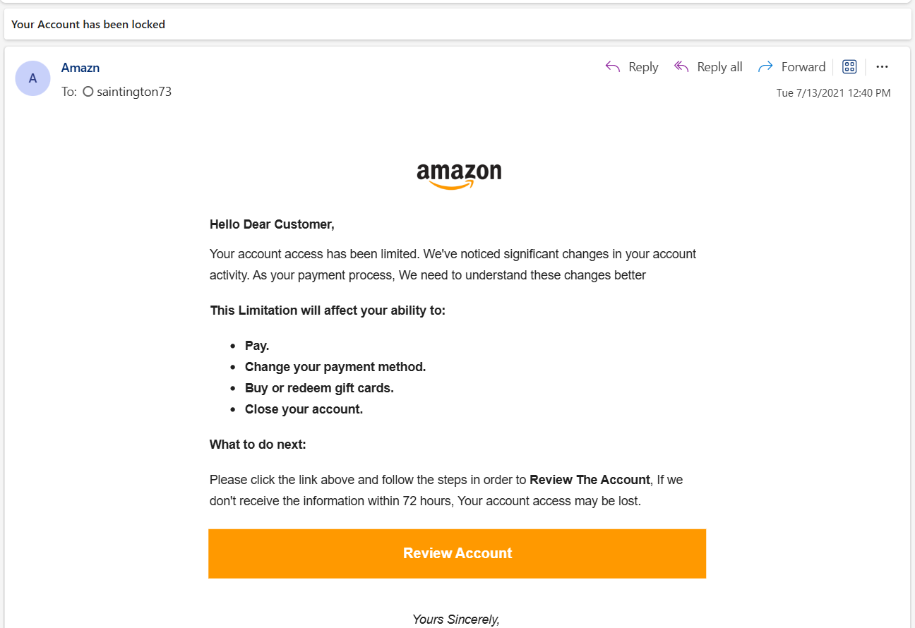 The brand name and logo in the body, plus the “Amazon” display name, indicate the attacker is imitating Amazon.