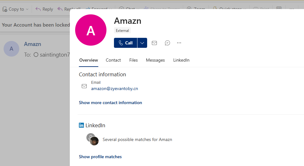 The visible name suggested “Amazon,” but the actual domain was zyevantoby.cn, which is a clear mismatch.