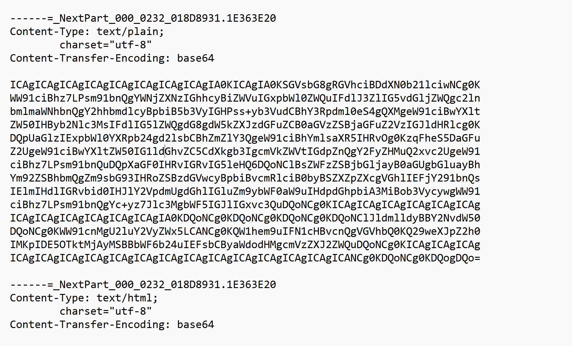 Located Content-Transfer-Encoding: base64 in the raw email headers/body.