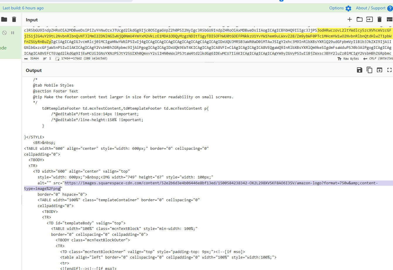 The HTML body is base64 encoded. I decoded it in CyberChef and extracted the image source URL from the HTML.