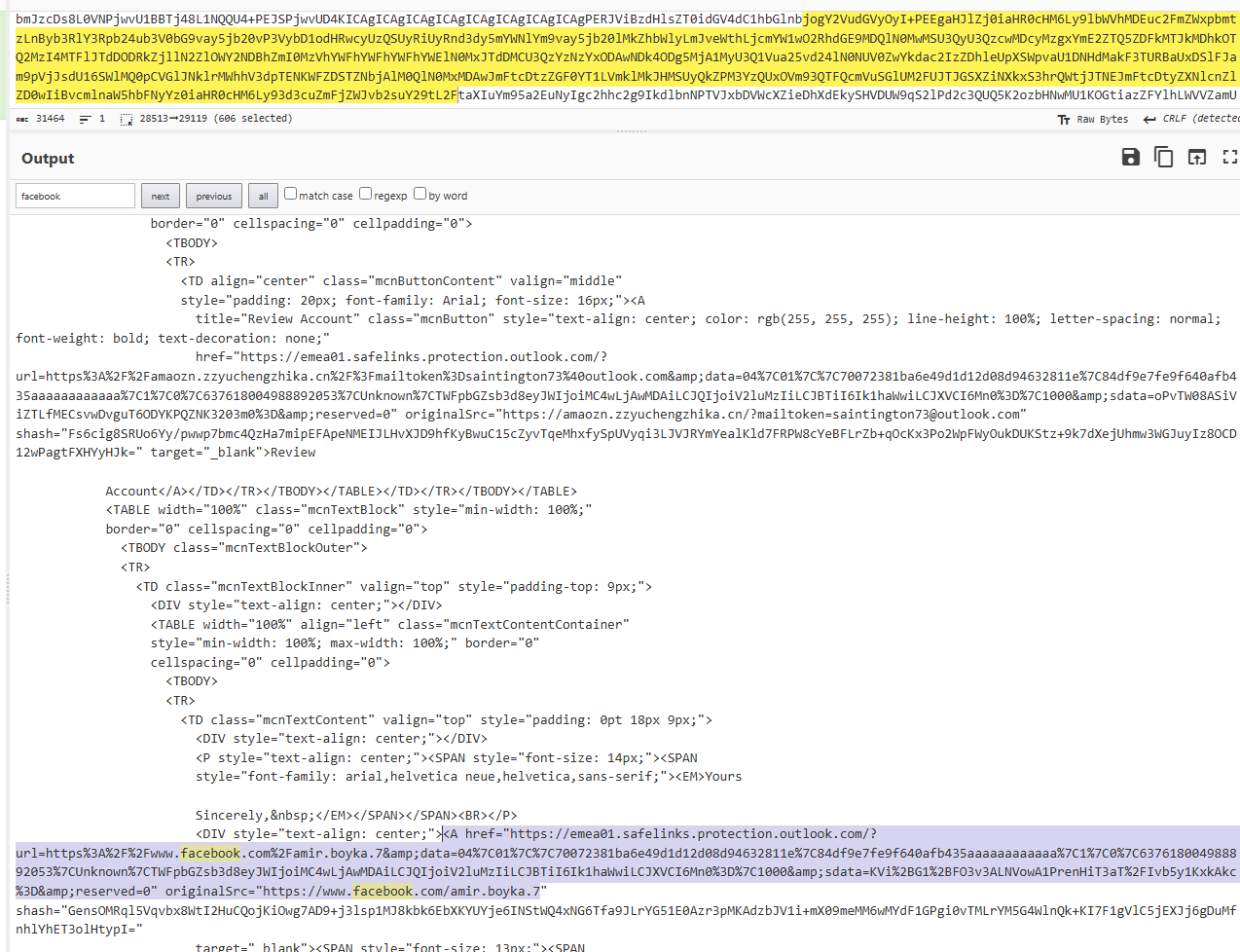 Searched the decoded HTML for “facebook”. The URL contains a profile link with username amir.boyka.7.